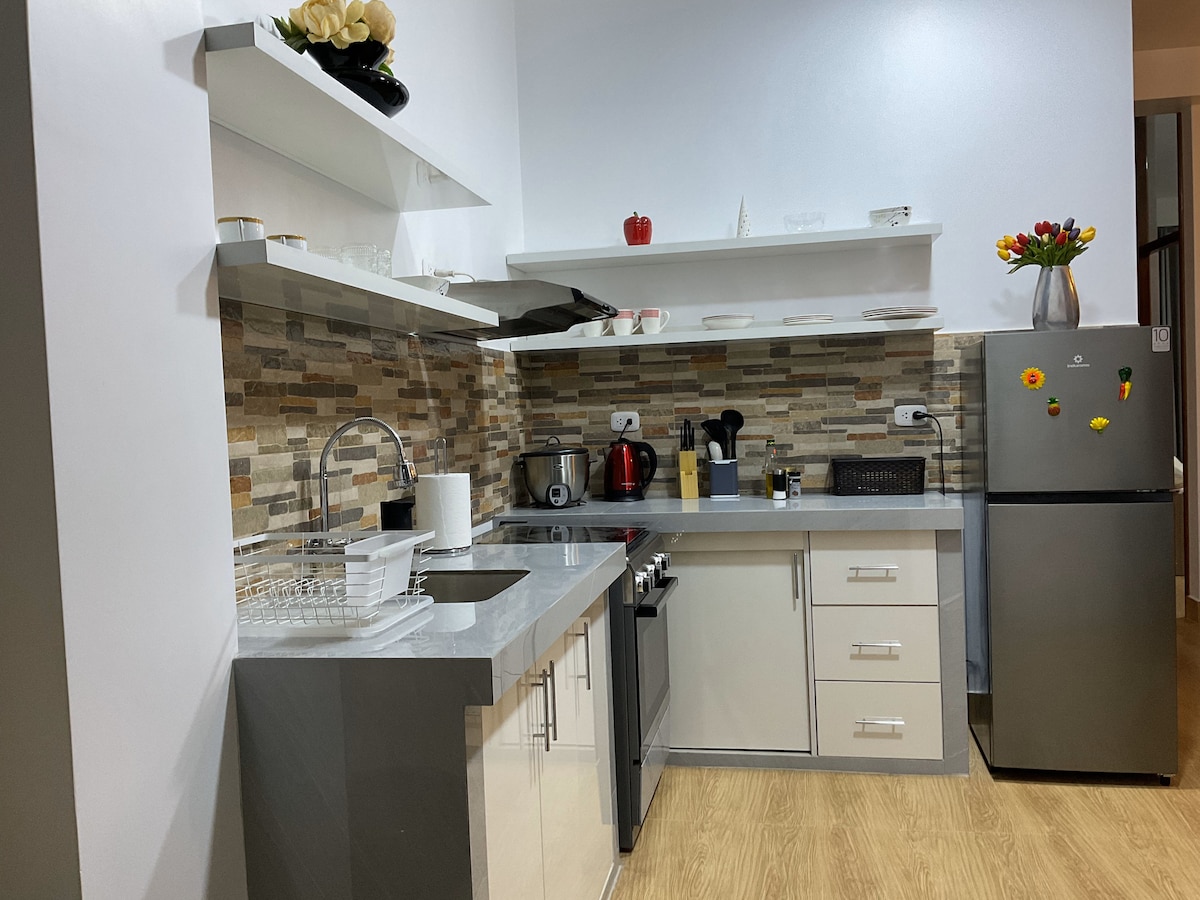 Lindo, moderno e espaçoso apartamento de 110 metros quadrados em um condomínio familiar, na esquina e com vista panorâmica parcial da cidade e do aeroporto de Tarapoto. Perfeito para um casal ou quatro pessoas, além de ter amplo espaço para adicionar uma cama. IMPORTANTE: - O preço publicado não inclui ar condicionado, este tem um custo adicional de S/15,00 cada por noite, somente se necessário.
