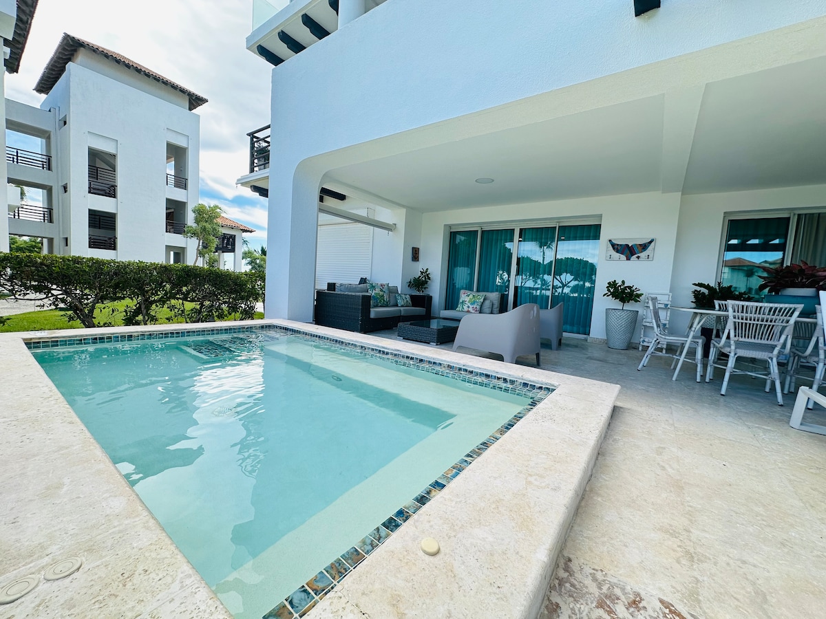 Escapadela moderna em Cap Cana a apenas 5 minutos da praia de Juanillo! Desfrute de vistas deslumbrantes para o campo de golfe Las Iguanas, refeições de luxo na Marina, diversão no parque aquático e atividades ao ar livre sem fim. Perfeito para os amantes da praia, golfistas e casais que procuram conforto e estilo numa das comunidades fechadas mais exclusivas da República Dominicana 🌴