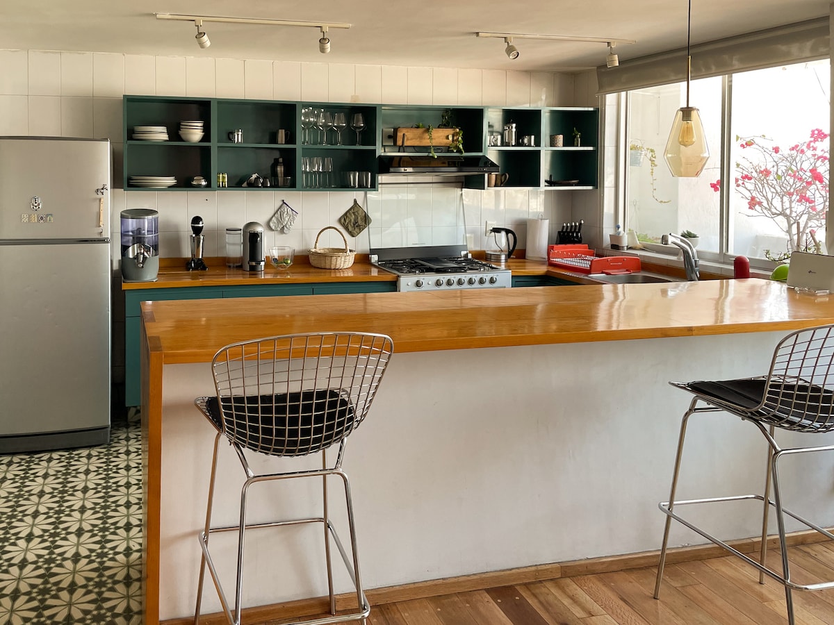 Abra as grandes portas dobráveis logo de manhã e entre num pátio verde para uma explosão de ar fresco e luz do dia. As grandes portas do chão ao teto mantêm o apto ventilado e fresco. Tetos altos com vigas de argila e madeira, cacho de luz e azulejos artesanais e piso de madeira. O espaço é silencioso, cuidadosamente decorado, muito agradável para trabalhar ou apenas para estar aqui. Este novo: https://www.airbnb.mx/rooms/1604605046335668118?guests=1&adults=1&s=67&unique_share_id=4dd1b1c9-fc93-4c94-9ca1-c91cd0256dae