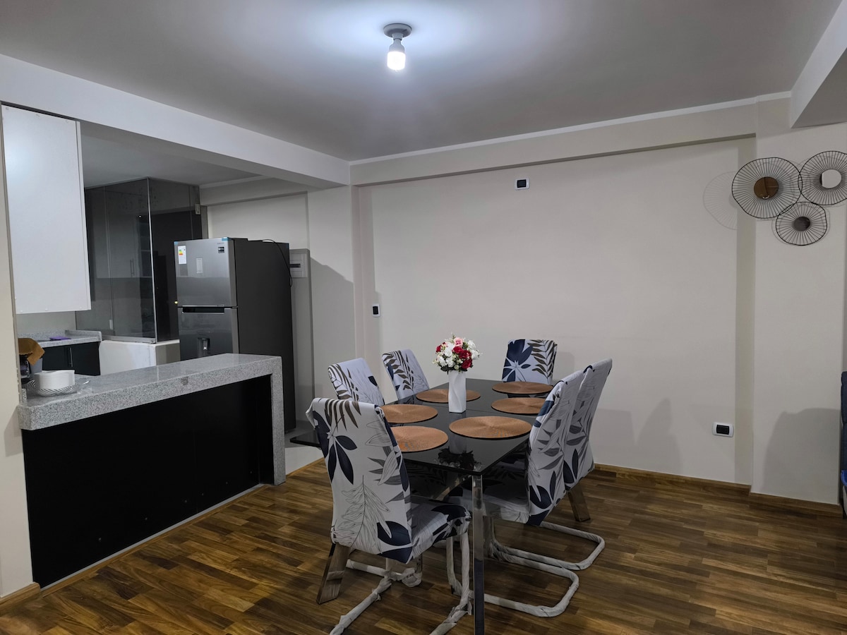 Leve toda a família para este espaço fantástico com muitas áreas para se divertir."Desfrute da sua estadia neste belo apartamento em Juliaca, a apenas 5 minutos da Plaza San José. Um espaço acolhedor, quente e bem equipado, ideal para descansar e sentir-se em casa. Perfeito para casais, famílias ou viagens de trabalho."