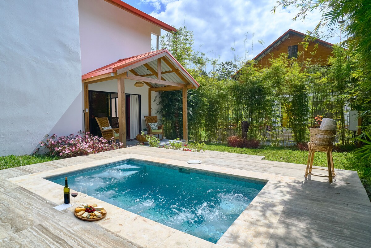(Absolute privacy) Espectacular one bedroom Villa located 14 min from the center of jarabacoa easy access on any type of car. Uniquely and personalized built to help couples scape from the wourld to a private and peaceful Stay. Private and heated pool right at the bedroom side, 360° rotating TV, king size bed, Elegant kitchen and amazing bathroom. Free wifi power by starlink.