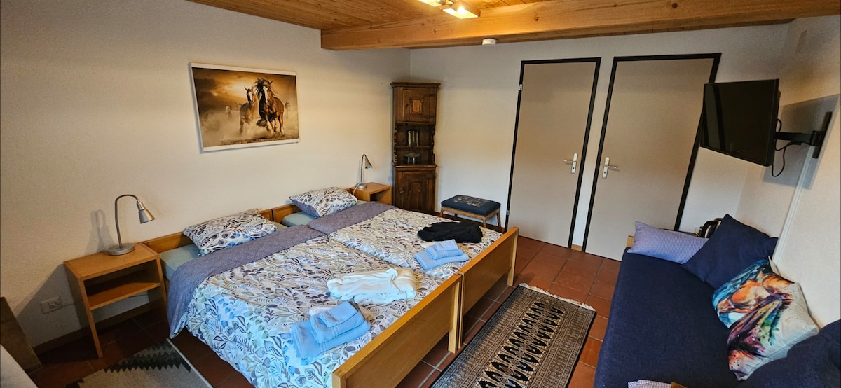Um andar inteiro só para você, em um chalé de madeira típico, no 1º andar Inclui: - 1 quarto com cama de casal e escrivaninha - sala de estar com sofá-cama e TV / sala de jantar com microondas, copos, pratos e talheres, cafeteira, chaleira e geladeira (SEM cozinha) - varanda - banheiro/chuveiro - vaga de estacionamento coberta - jardim, churrasqueira disponível localizado no campo, entre as montanhas, a 10 minutos de Bienne (de carro ou de trem, estação de trem a 5 minutos a pé)