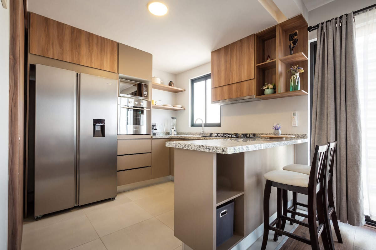 Novo em folha, localizado no coração de Juriquilla, este apartamento de 160 m2 oferece uma experiência única, indo além das comodidades e entretenimento. Se está à procura de alta qualidade, não procure mais e venha para o apartamento mais moderno e luxuoso de Queretaro para uma estadia inesquecível. A uma curta distância a pé do Starbucks, Walmart, bares e restaurantes de topo como o Sonora Grill & Hunger, este apartamento tem tudo, camas confortáveis, varanda, TV OLED 4K e um Home-Cinema de 100" a partir da sua cama