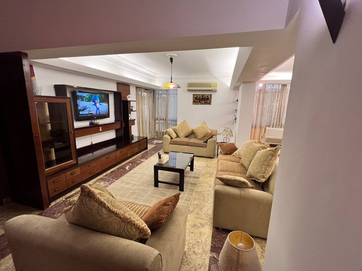 Apartamento de luxo lindamente projetado. Piso privativo de 2400 pés quadrados. Um refúgio perfeito para famílias/indivíduos que procuram uma estadia bem mobiliada em Ard El Golf- Heliopolis Cairo. Uma vista panorâmica do jardim, juntamente com a área ensolarada, servida com ar condicionado (frio e calor). Comodidades inspiradas em alto padrão. Bairro acolhedor. A estação de metrô fica a 8 minutos a pé, famosos shoppings e mercearias estão bem próximos. Por toda parte, nada é melhor do que um local seguro único.