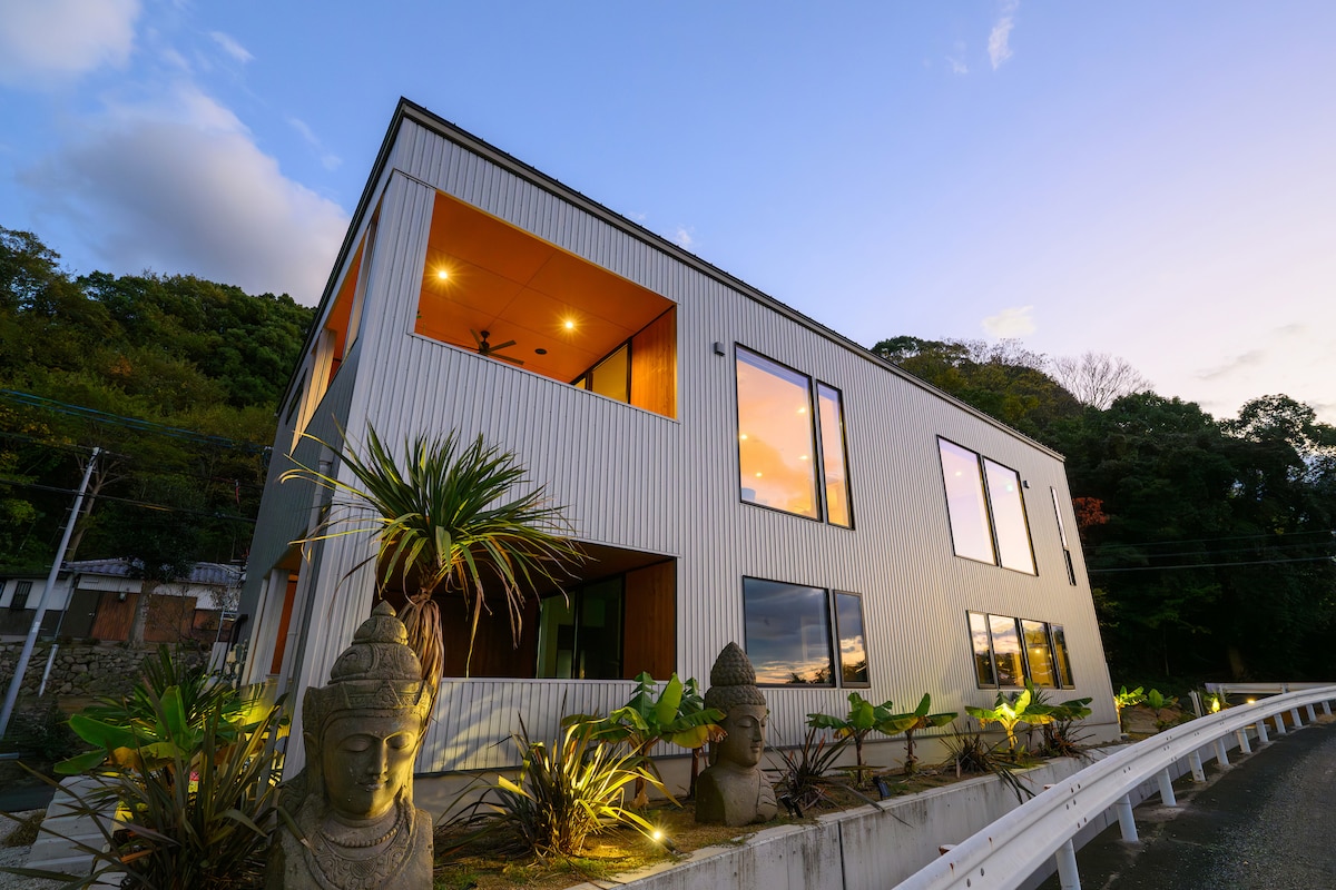 Welcome to our private villa. 1日1組限定の一棟貸切ヴィラです。チェックインからチェックアウトまで、空間はすべてお客様だけのもの。周囲を気にせず、ゆったりとお過ごしいただけます。 このヴィラの特徴は、庭と室内をつなぐ大きな窓。自然光が差し込み、室内にいながら開放感を感じられる空間です。昼は明るく、夜は落ち着いた雰囲気の中でリラックスできます。 ベッドはシングル4台・ダブル2台、最大8名様まで宿泊可能。家族旅行、友人グループ、三世代旅行にも最適です。 リビングには快適な家具を揃え、Nintendo Switch 2もご用意しています。皆さまで楽しむ時間も、それぞれの時間も大切にできます。 キッチンは自由にご利用可能です。お米やパスタなど簡単な食材、基本的な調味料・調理器具を備えています。到着後すぐに調理できます。 テラスにはガス式BBQグリルがあります。火起こし不要で簡単にご利用いただけます。(食材はお持ち込みいただけます) 父母ヶ浜まで車で約1分。観光にも便利な立地です。