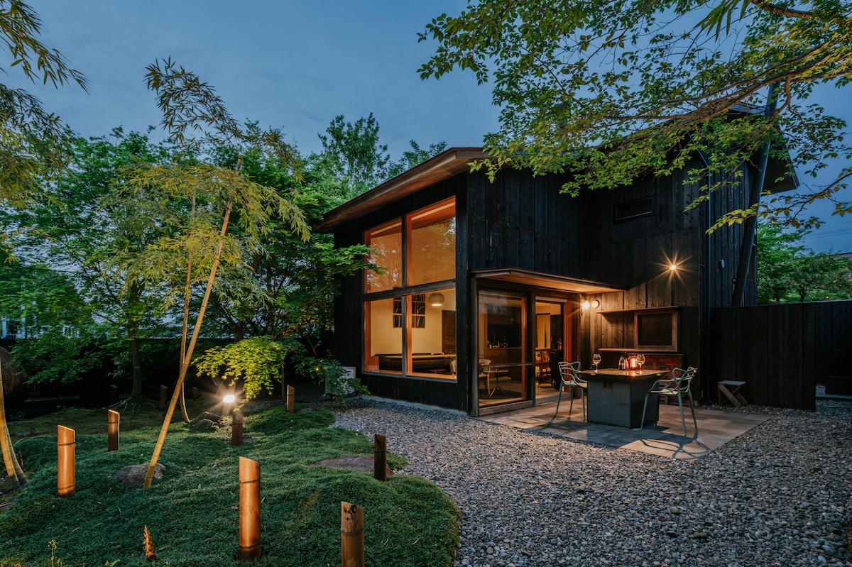 別邸|揺らぐ炎に癒やされる。五右衛門風呂と薪ストーブがある、焼杉の家