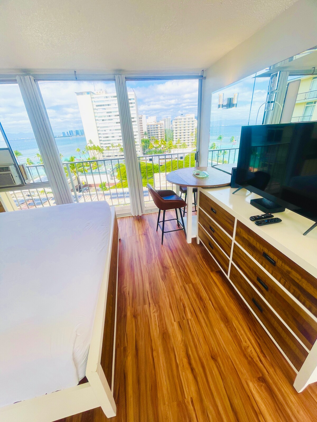NEW! Waikiki City View Studio. This newly renovated studio offers 382 sq. ft. of stylish living space with a spacious lanai, where you can enjoy breathtaking city&Koolau mountain views and enjoy your meal. Sleeping Arrangements: • King-size bed for ultimate comfort • Two twin-size Japanese-style futons Kitchenette Amenities: • Electric kettle with complimentary ground coffee and hibiscus tea • Portable induction stovetop for light cooking • Dinner plates, bowls, microwave, and wine cellar