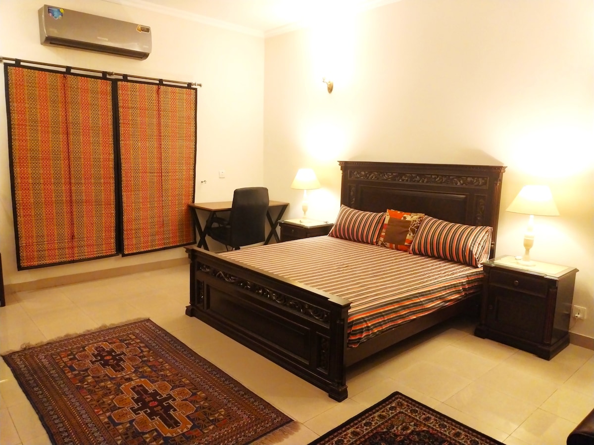 Localizada numa área privilegiada de Lahore, esta casa de 1 quarto totalmente mobilada é perfeita para famílias, casais, paquistaneses estrangeiros e estrangeiros. A poucos minutos da Mall Road, Cantt, DHA e Raya, é seguro, central e de fácil acesso. A casa possui uma casa de banho anexa, lavabo, sala de estar espaçosa, cozinha com talheres, área de jantar, relvado privado com assentos e um grande alpendre de carro. Conforto, conveniência e segurança num só lugar! Por favor entre em contacto com o anfitrião antes de reservar.