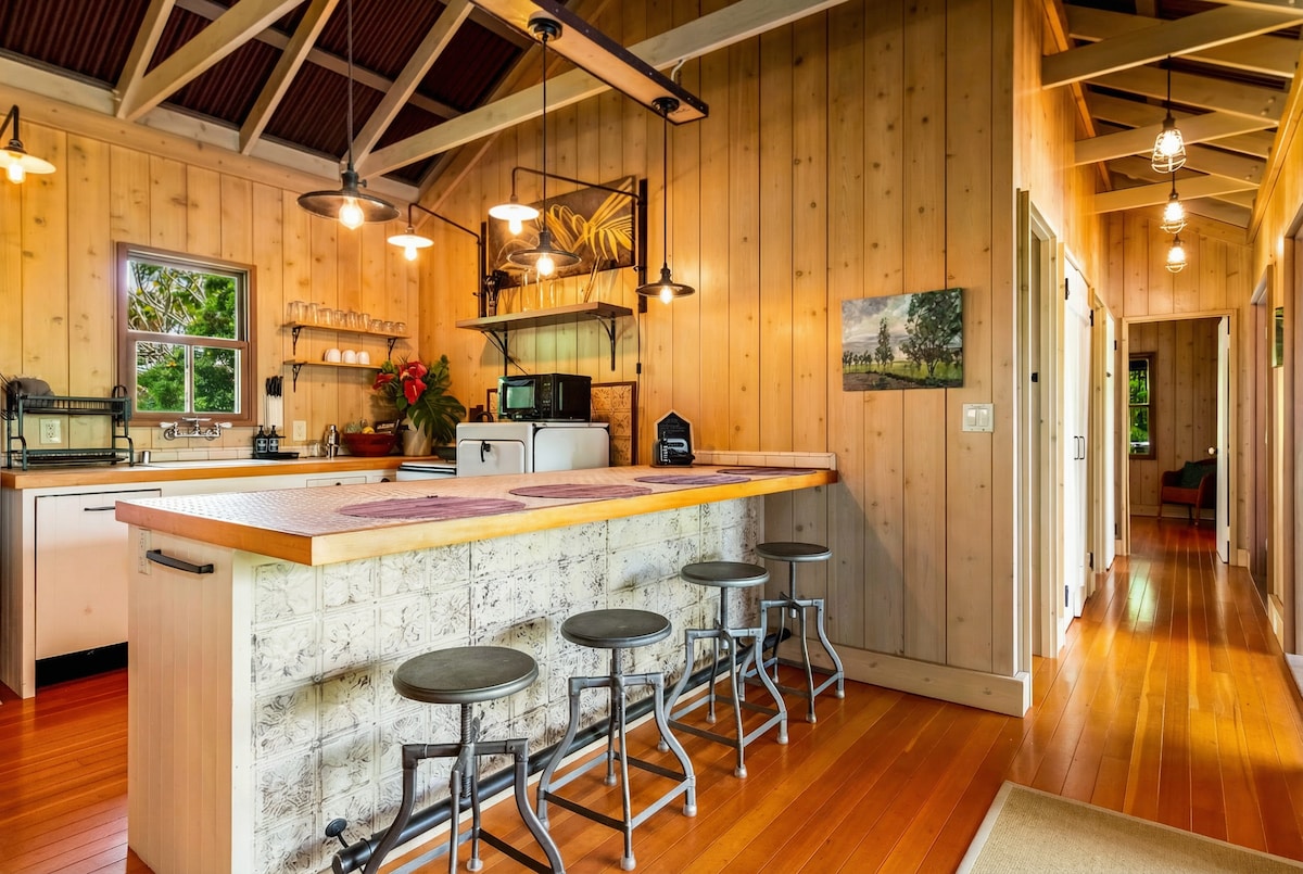 Entre no charme intemporal do antigo Havai neste retiro tropical artesanal. Inspirada na arquitetura da ilha da década de 1930, esta casa combina madeira natural, tetos de vigas abertas e confortos modernos num espaço que parece elevado e aterrado na natureza. Acorde com o canto dos pássaros e adormeça com o suave coro das rãs Coqui. Desfrute do seu café 100% Kona de cortesia no arejado lanai e, em seguida, faça um curto passeio até ao parque à beira-mar para ver o nascer do sol do Pacífico de tirar o fôlego.