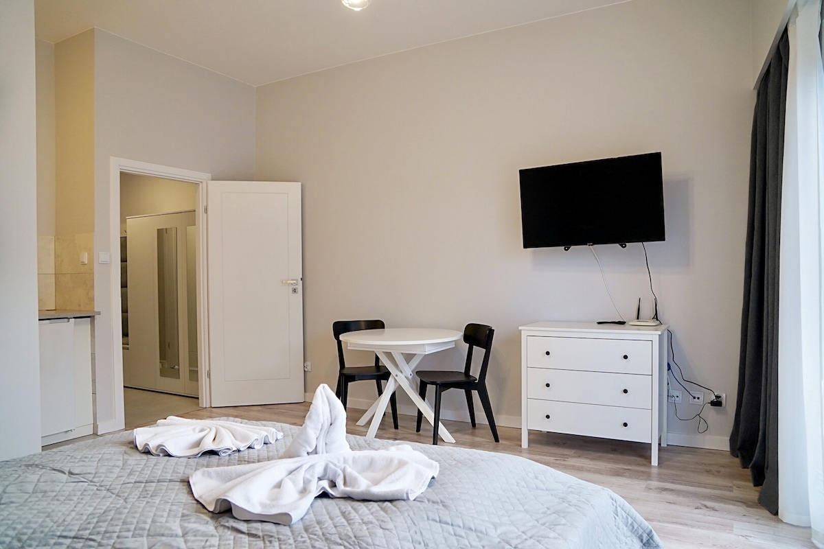 Temos um apartamento para oferecer a você, composto por um quarto com cozinha e varanda, banheiro com chuveiro e hall de entrada. Ótima localização - 300 m da praia, 500 m do cais. Apartamento perfeito para famílias. Em frente ao edifício residencial, há também uma entrada para o belo Parque Nacional de Wolin. Bairro muito tranquilo. Apartamento totalmente equipado. No apartamento, há um quarto conectado à cozinha e ao banheiro.