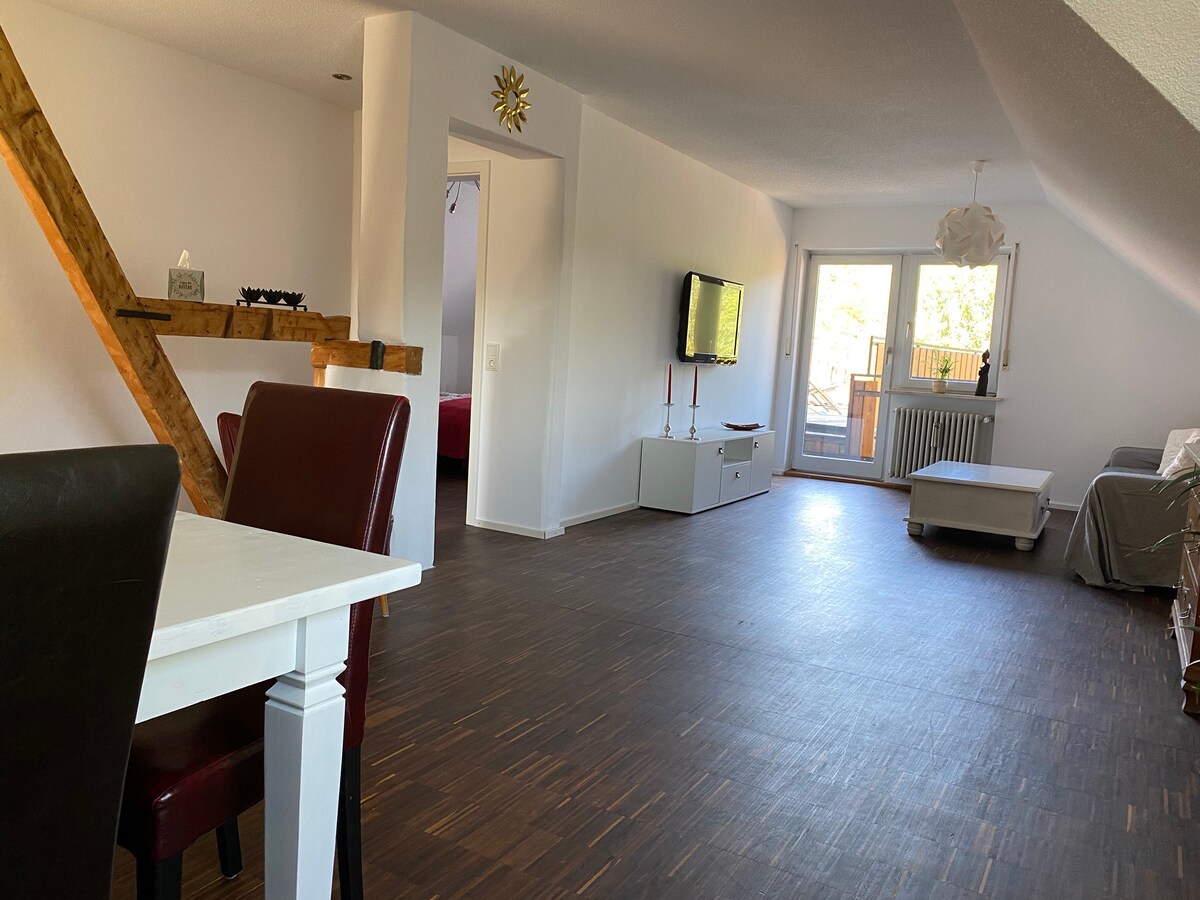 Schöne, helle, renovierte Dachgeschosswohnung in über 100 Jahre altem Haus mit Garten, Hof und Scheune. Super zentral gelegen - nur 1 Minute zur schönen Stadtmitte von Kandern. Alle wichtigen Geschäfte und Einrichtungen zu Fuß in weniger als 5 Minuten erreichbar. Genügend Parkraum vorhanden. Öffentlicher Nahverkehr gratis bis Grenze Schweiz und Frankreich. Entfernung mit dem Auto: Lörrach (20 Minuten), Basel (25), Flughafen Basel/Mulhouse (30), Freiburg + Mulhouse (45), Europapark (55).