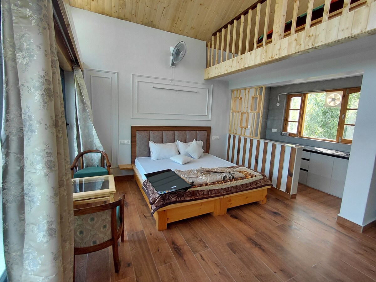 Have fun with the whole family at this stylish place. You will have spacious and Luxury Duplex chalet suitable for one couple or a family of four guests. ★ Master bedroom & attic ★ Wooden & Stone Architecture ★ Panoramic Valley view ★ Nearby Paragliding site ★ Bathtub ★ Power backup ★ WiFi ★ Indoor Fireplace ★ in-house food service ★ Garden & Bonfire area Please note : - Breakfast, Meals, Room heaters, Firewood, & all other services are exclusive of stay price here