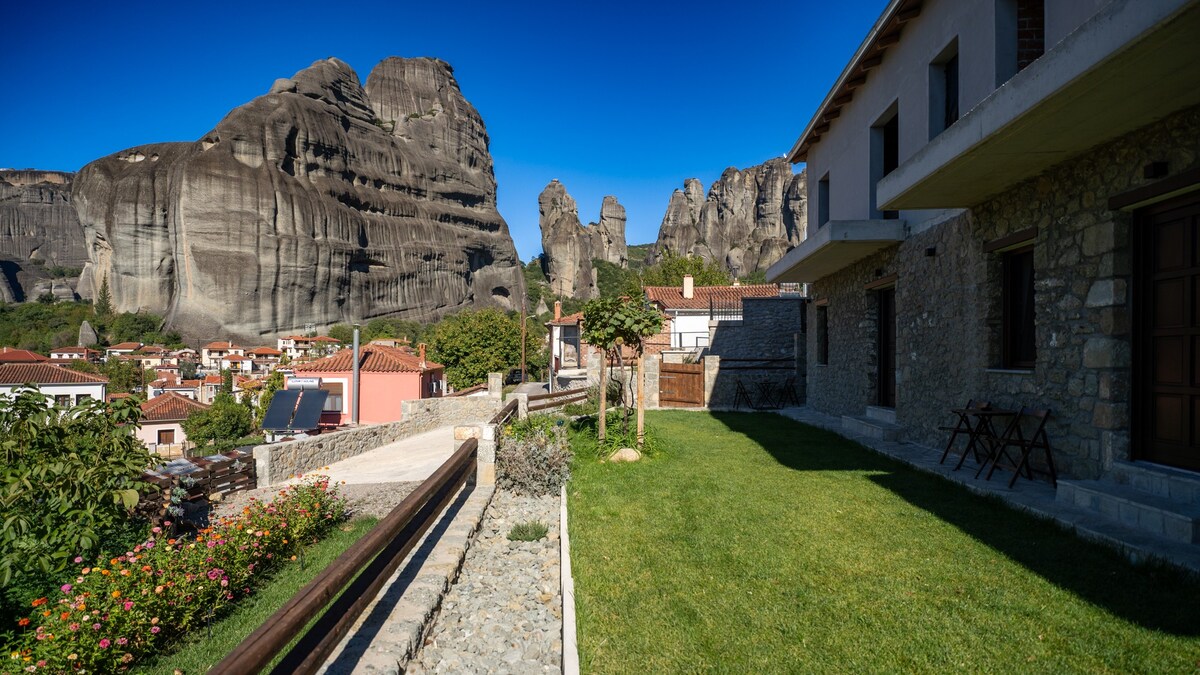 Modern, new studio lets you wake up under the rocks of Meteora.This fully equipped studio is perfect for travelers and couples seeking an unforgettable getaway.Start your morning with a traditional Greek coffee in our yard.Enjoy the tranquility and the sounds of our own private retreat, with the adventure of Meteora at your doorstep!
