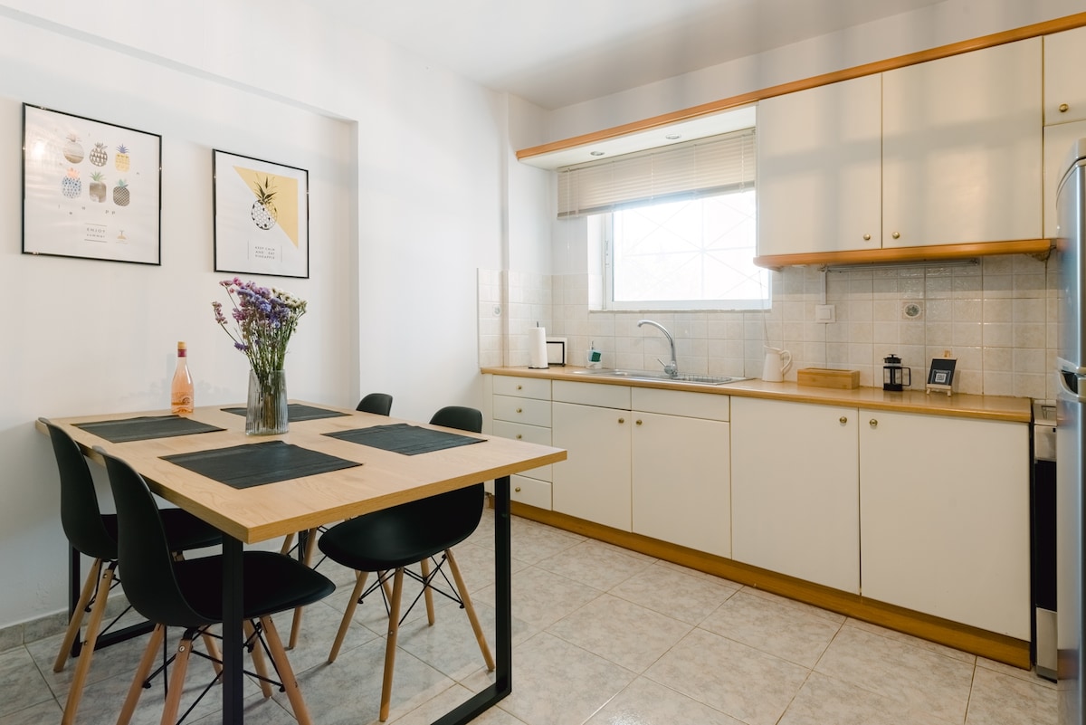 Eu sou Andriana, metade suíça, metade grega e eu sou sua anfitriã. Localizado no coração de Patras, este belo apartamento de 2 quartos fica dentro de um edifício pré-guerra que pertencia ao meu avô grego. O edifício abriga o mais antigo elevador em funcionamento em Patras, embora um novo elevador o leve diretamente para o 4º andar, onde você pode desfrutar de vistas espetaculares para o mar a partir da varanda. Embora a poucos passos de todas as lojas, restaurantes e bares, o apartamento continua sendo um espaço tranquilo.