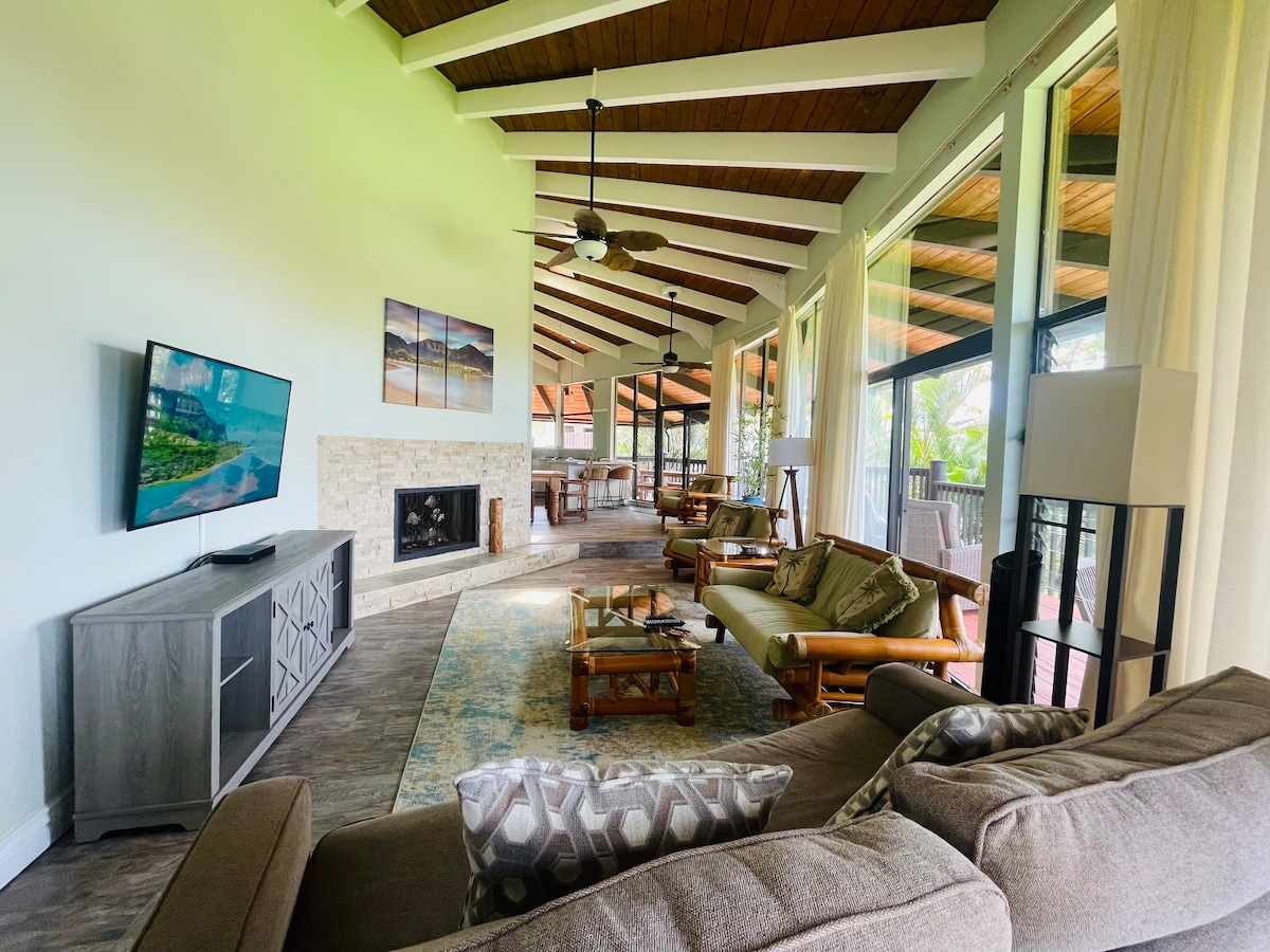 Condomínio Oversized 1500 sq. ft North Shore. Janelas do chão ao teto, proporcionando muita luz natural e dando ao condomínio uma sensação de casa na árvore. Enorme mais de 800 pés quadrados envolvente em lanai com vista para o maior espaço aberto do complexo, perfeito para pequenos-almoços matinais e relaxantes à noite. O complexo possui uma das maiores piscinas de Princeville, um pavilhão com churrasqueira, mesa de pingue-pongue e espreguiçadeiras. Vários conjuntos de snorkel, pranchas de boogie, cadeiras de praia, toalhas, brinquedos de areia fornecidos para uso!