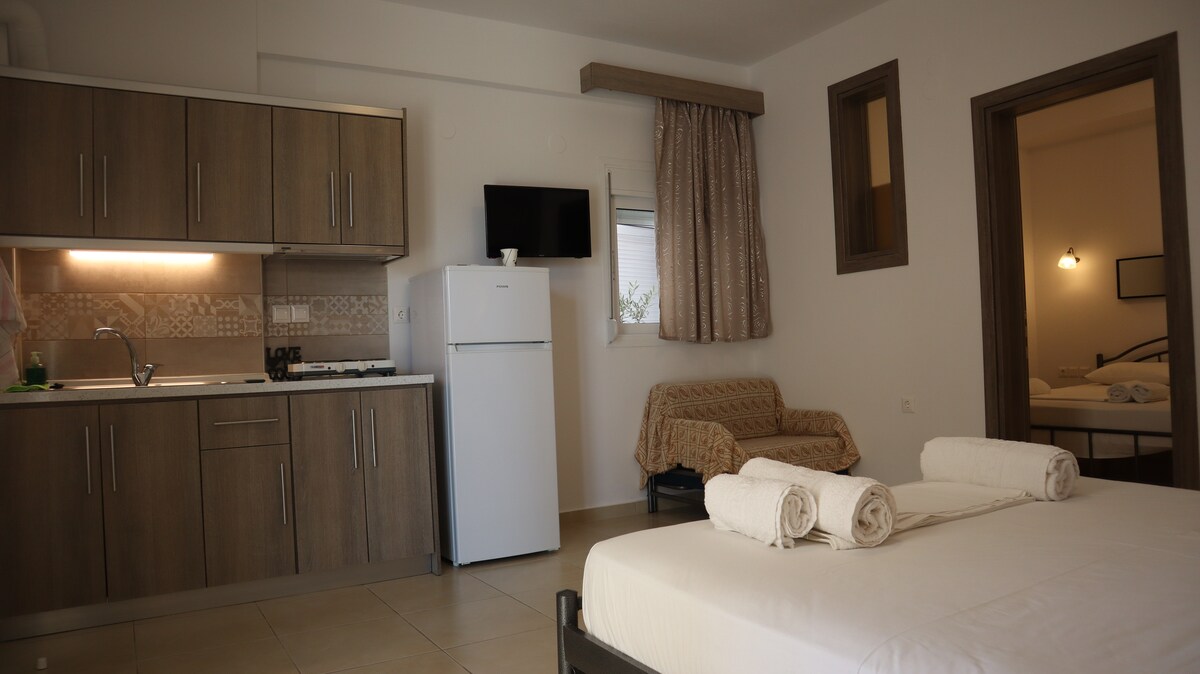 O Studio Wilem está localizado no segundo andar de um edifício de dois andares na antiga Sarti, a apenas 30 metros da praia, mas também da praça central da vila. Apenas uma rua o separa da praia com suas muitas tabernas, bares de praia, cafés, lojas, que estão disponíveis 7 dias por semana. Tem uma cama de casal, cujo colchão é feito de espuma de memória para um sono confortável e relaxante.