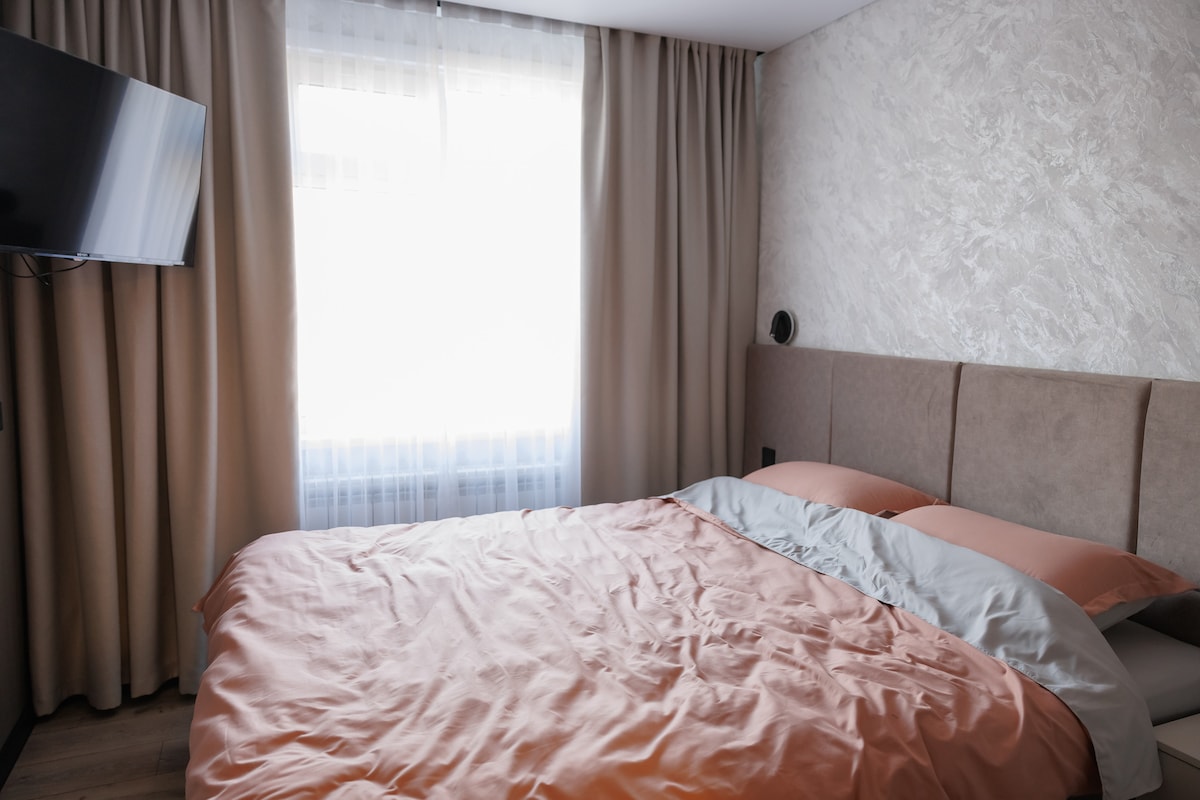A clean, bright apartment with 3 sleeping places (a separate bedroom + a children’s room on the second floor, and an L-shaped sofa in the living room), with access to a private terrace. Ceiling height is 4 meters. Located in the Promenade Burabay cottage community. The complex features a barbecue area, a children’s playground, guarded parking with video surveillance, and a walking alley leading to Lake Borovoe, just a 5-minute walk away (exit to Wyndham Beach).