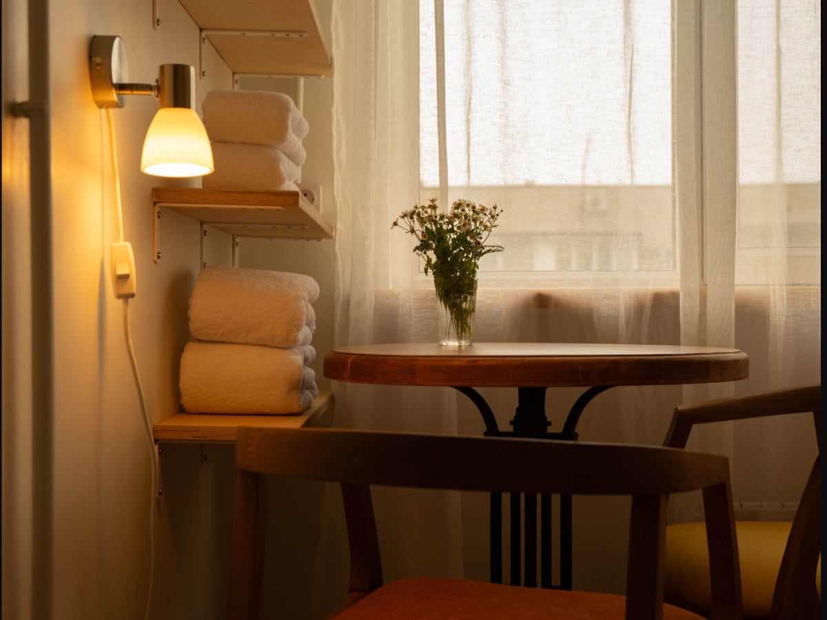 UY - Urban Yurt é uma casa de hóspedes no centro de Almaty, com quartos confortáveis e casas de banho privadas compactas. A nossa casa de hóspedes tem cinco andares e 15 quartos privados, todos concebidos para lhe proporcionar uma estadia acolhedora e acolhedora. Este quarto de 18 m² está localizado no terceiro andar.