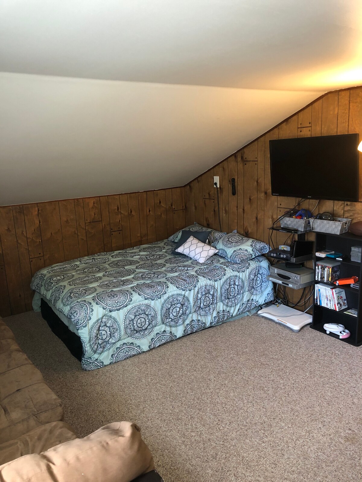 Este quarto é um loft acima da garagem da barraca mais distante com acesso a uma banheira de hidromassagem (aberta o ano todo) e piscina aquecida e bar tiki (aberto no verão). Esta é mais uma estadia de verão devido às comodidades que estão disponíveis. Mas as pessoas ainda vêm no inverno porque baixamos o preço e mantemos a banheira de hidromassagem disponível. Divulgação completa, a caminhada do quarto para a casa/banheiro não é aquecida no inverno e pode ser uma caminhada longa e fria para algumas pessoas, por isso tentamos deixar isso bem claro antes de você reservar.
