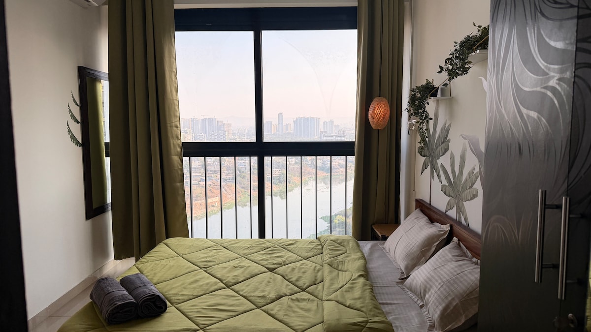 Nest (Suite 1BHK AC) 32º andar vista esplêndida da cidade de Pune. #Área de Estar: Ar condicionado Televisão 56incs Smart 4KHD 🎶 Experiência musical Alexa ECO Livros, Cartões e Ludo Sofá-cama queen size Mesa de jantar/trabalho com cadeiras Ligação à Internet de banda larga. Varanda #Kitchenette: Forno de Micro-ondas Placa de indução Chaleira 🔥 Torradeira French Press Utensílios de cozinha Crockeries Canecas de café Complementares #Quarto Ar condicionado Cama queen com mesas de apoio Espelho de vestir Roupeiro Varanda