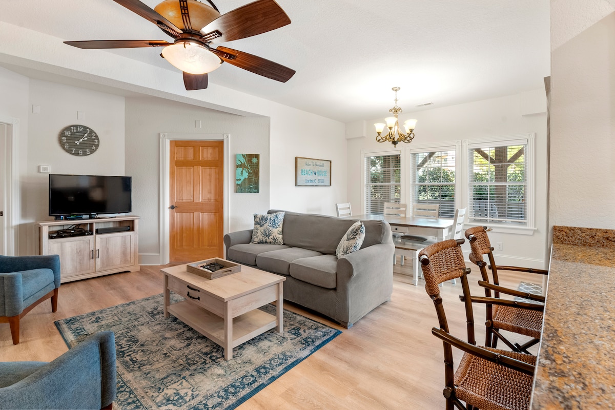 Nosso apartamento é o lugar perfeito para férias em família, um fim de semana romântico ou uma viagem para a praia. A cozinha está totalmente abastecida para aquelas refeições caseiras. A sala de estar tem uma pequena área de jantar, um sofá-cama e leva ao convés, que tem vista para a área comum. O quarto principal tem uma cama queen size, uma área de leitura e uma escrivaninha. Uma cama dobrável e um berço portátil estão escondidos no armário. O segundo quarto tem um sofá futon, uma cadeira futon e um armário cheio de itens de praia. A diversão espera por você!
