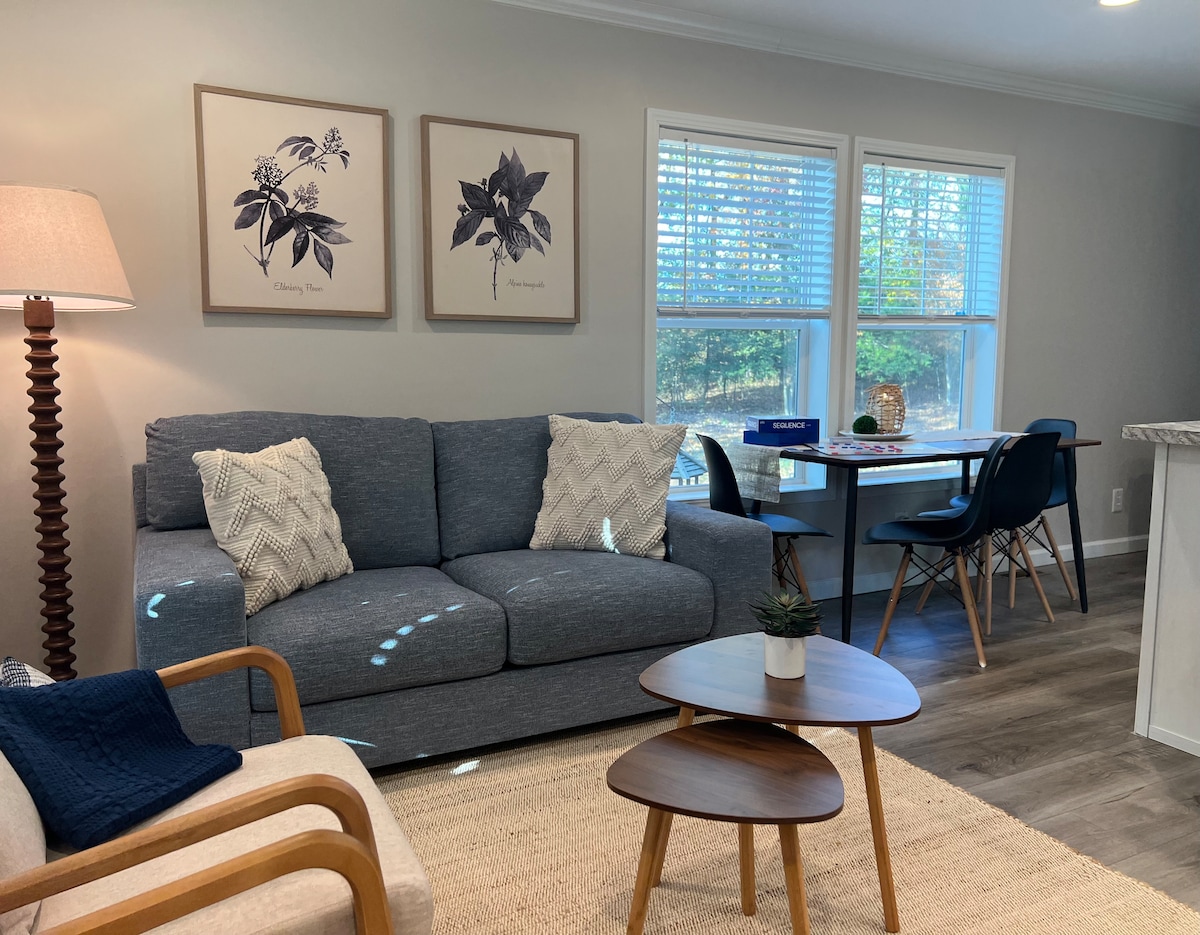 Escape to Gracewood Cottage, a private 2-acre wooded retreat in King George, VA—just 25 minutes from historic Fredericksburg and about an hour from Washington, DC. This cozy 2-bedroom, 2-bath home offers modern comfort with outdoor seating, a fire pit, and a private walking trail—perfect for couples, small families, or guests looking to slow down and recharge.