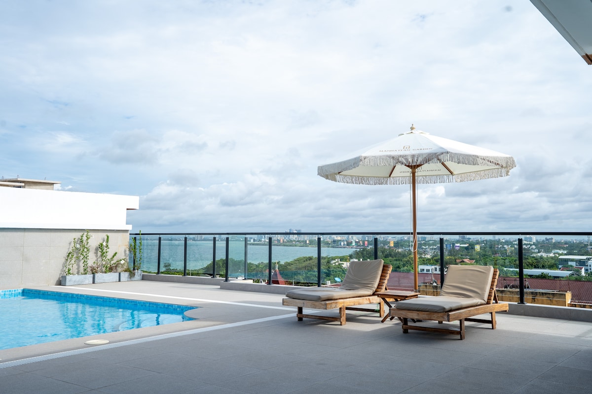 Experimente a vida de luxo na próspera Masaki no Manhattan Garden. Este moderno apartamento de 2 quartos oferece Wi-Fi, A/C, varanda, micro-ondas, frigorífico, fritadeira (sem fogão) e estacionamento gratuito coberto. Relaxe nas piscinas no terraço (adulto + criança) com vistas deslumbrantes para o mar, mantenha-se em forma no ginásio ou deixe as crianças desfrutarem do parque infantil. A poucos minutos da praia, restaurantes e lojas, é o refúgio perfeito para férias, negócios ou estadias prolongadas no bairro mais exclusivo de Dar es Salaam.