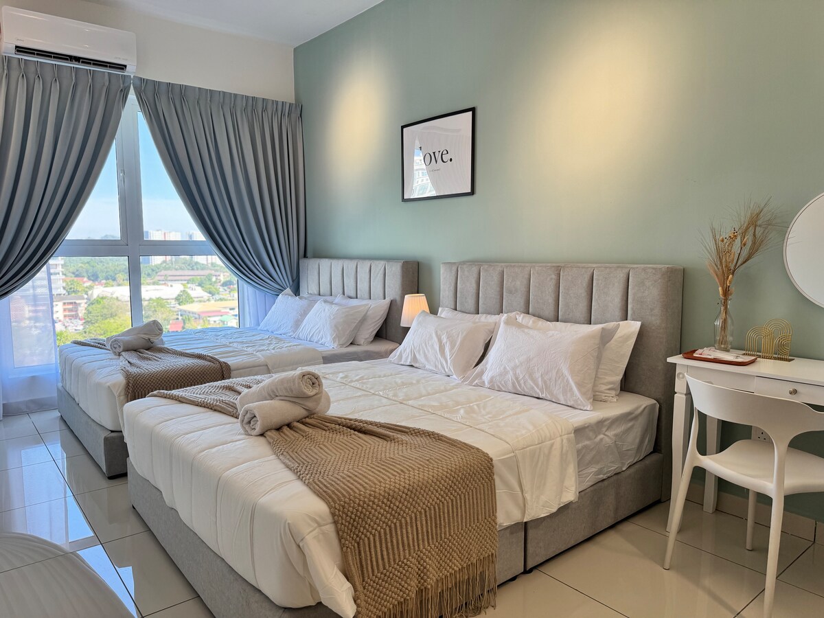 Bem-vindo à sua casa longe de casa! Desfrute de uma cozinha totalmente equipada, uma espaçosa área de estar com smart TV e duas confortáveis camas queen. A unidade também inclui Wi-Fi de alta velocidade, estacionamento gratuito e uma varanda privada. Localizado no centro da cidade de Ipoh, estará perto de cafés locais, do centro comercial, da feira de artesanato e de boutiques. A apenas 10 minutos de carro do centro da cidade e das principais atrações. Perfeito para casais, trabalhadores remotos ou famílias pequenas.