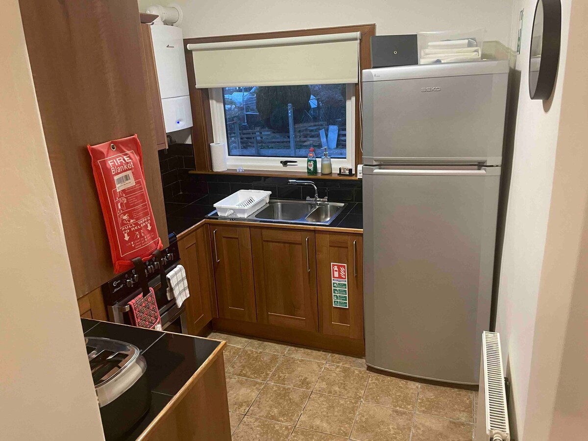 Come & relax in the cozy cabin in a peaceful location with friendly highland cow neighbours. A self contained space with kitchenette & shower-room. The kitchenette includes a sink, fridge, kettle, toaster & microwave. Please note, there's no oven/hob. There's plates, cups, glasses and cutlery. There's broadband & Freesat TV. You'll find a hanging rail & chest of drawers for storage. The cabin is in a separate area of the property with its own private garden/patio. Parking is available.