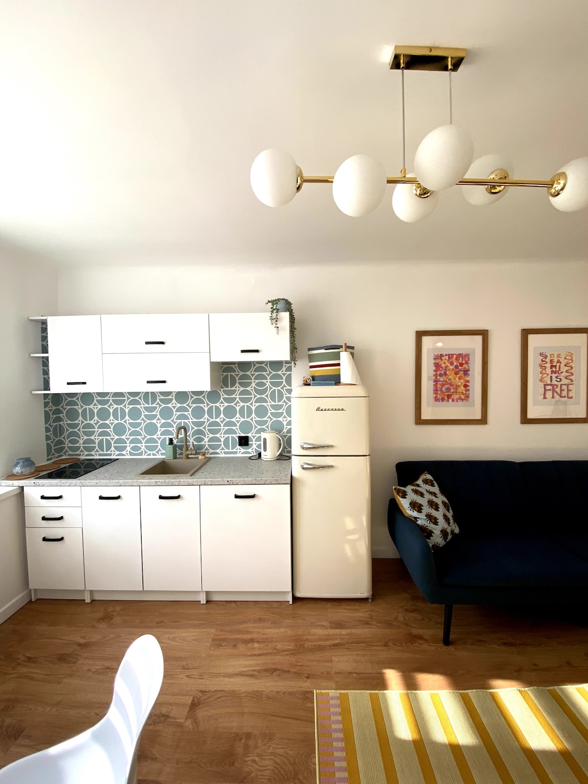 O apartamento é composto por uma sala de estar com uma kitchenette, um quarto, uma casa de banho e uma varanda. SALA DE ESTAR: sofá-cama de casal, mesa com 4 cadeiras, mesa de centro, cómoda, candeeiro, TV QUARTO: cama de casal, roupeiro, prateleiras de secretária, candeeiro COZINHA: frigorífico, máquina de lavar louça, forno, placa elétrica, micro-ondas, chaleira elétrica, máquina de café, pratos básicos, talheres. Forneço roupa de cama, toalhas, sabão, detergente para a loiça, cubos para a máquina de lavar louça, detergente em pó. Bairro muito tranquilo, sem ruído da rua.