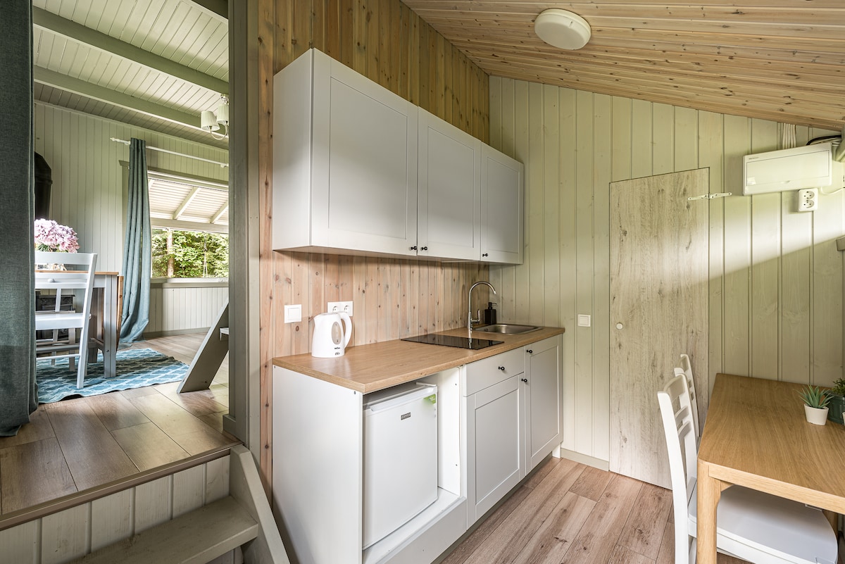 2020 07 mėn. duris atvėrė naujai renovuotas, stilingas "Pamario namelis". Namelio erdvė išsidėsčiusi per du aukštus ir skirta 3 asm. Pirmame aukšte rasite mini virtuvėlę, svetainės zona su išskleidžiama kampine sofa (145x200), wc. Iš pirmo aukšto patogiais laiptais patenkama į miegamąjį. Jūsų patogiam poilsiui yra dvigulė lova (160x200). Pro stoglangį patenkanti šviesa iš pietų miegamajam suteikia malonų šviesos ir erdvės pojutį. Prie namelio yra terasa su lauko baldais, skirta tik Jums.