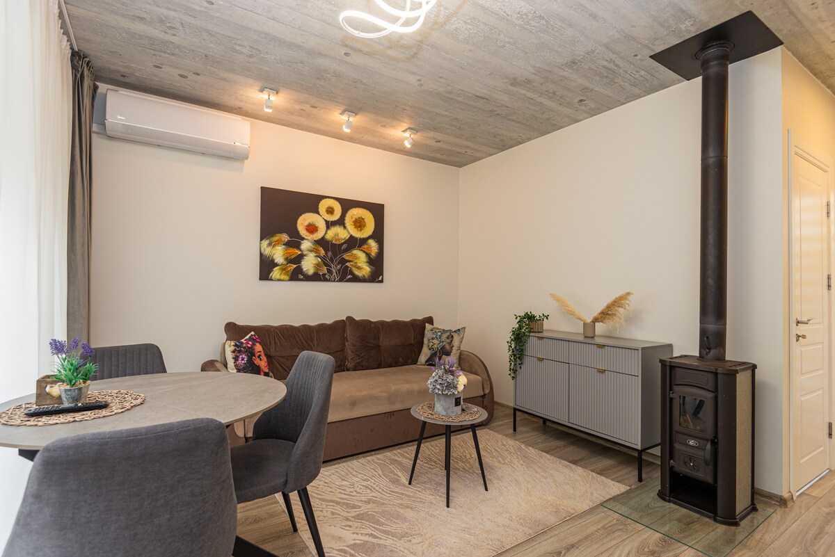 Novo apartamento espaçoso e amigável com um terraço equipado para atender às necessidades de um turista independente. A casa tem tudo para o fazer sentir-se em casa, incluindo uma cozinha confortável, aquecimento do chão, ar condicionado, chuveiro e WC, quarto + loft para adultos e crianças, colchões confortáveis. A casa oferece 6 lugares para dormir: 2 camas de casal e sofá-cama. Berço, cama de almofada de cão, conjunto de trabalho, cabo EV Type2 disponível mediante pedido.