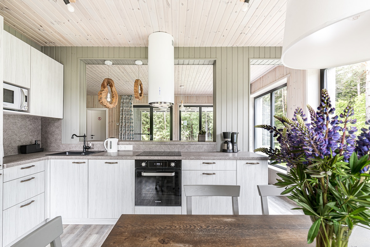 Casa totalmente privada e incrível localizada na floresta, a 300 metros do lago Plateliai. O terraço tem uma rede de loft, banheira de hidromassagem gratuita e ilimitada, churrasqueira Kamado e vista deslumbrante para a floresta. Dentro há uma lareira, sensação moderna e tudo o que você pode precisar para uma estadia confortável. A cozinha está totalmente equipada, você encontrará máquina de café Dolce Gusto, Ar-condicionado. Ao lado da casa há um centro de equitação (você pode ver os cavalos do terraço) onde você pode ter aulas ou ir rastrear.