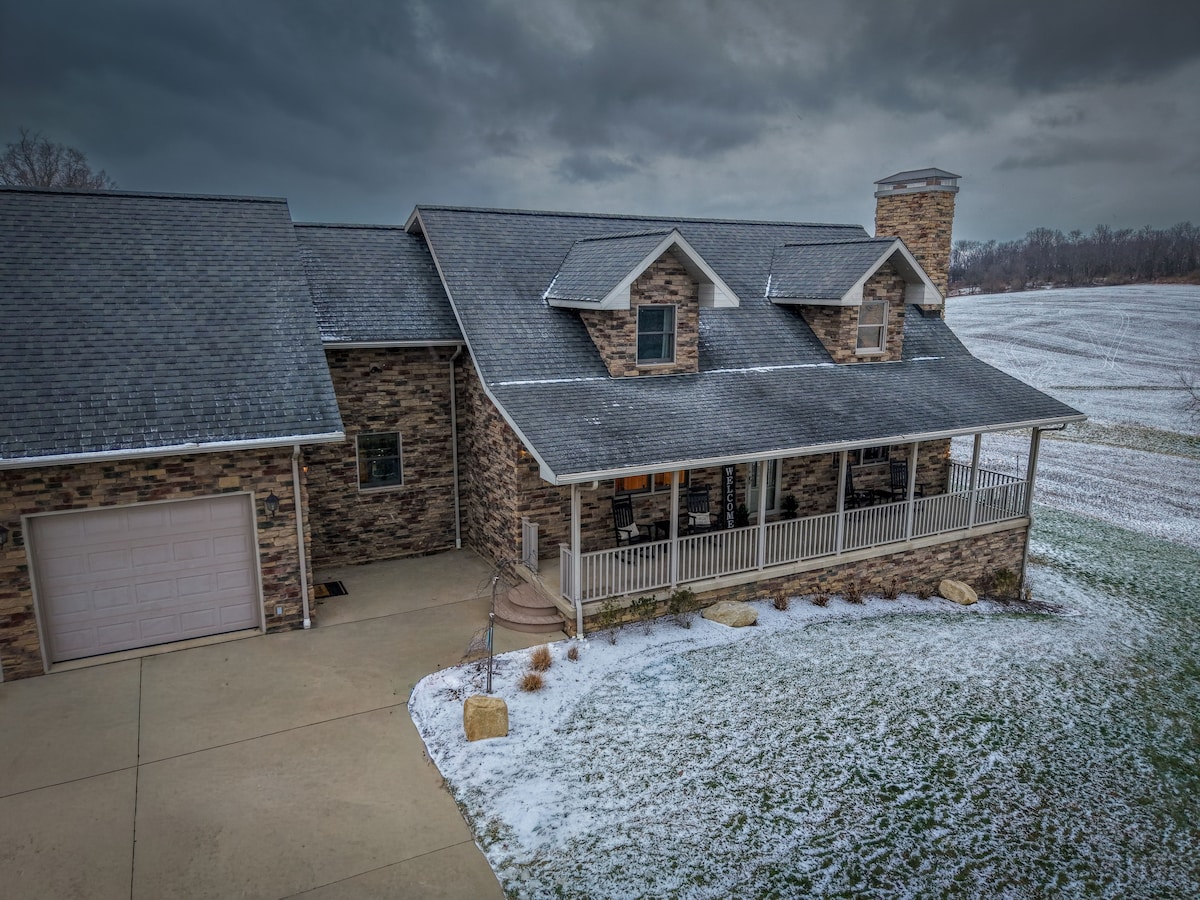 Fique na nossa casa de campo de inspiração francesa de 1852 em 5 hectares panorâmicos no coração do país Amish. Desfrute de vistas panorâmicas do rio Kokosing, amanheceres e entardeceres espetaculares e as luzes noturnas cintilantes do Kenyon College. Perfeita para pais que visitam Kenyon, reuniões familiares ou um retiro relaxante, a casa dispõe de Internet Starlink de alta velocidade, uma cozinha recentemente remodelada com um fogão Viking Range comercial e um deck lindamente atualizado, o local perfeito para apreciar o pôr do sol.