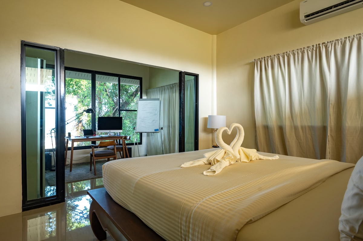 Up to 35% - long stays during low season. 2023 built, simple bungalow, big balcony, spacious bathroom with walk-in shower. Tinted windows from floor to ceiling, blackout curtains + mosquito nets. Equipped for a short or long vacation, right in the heart of Lonely Beach village. Hairdryer, toaster, kettle, microwave, fridge, TV, aircon, floor fan, workspace, large king-size bed, clothes boxes, clothes hanger, safe deposit. The exact location is on the map - Bamboo Hut restaurant, no fraud.