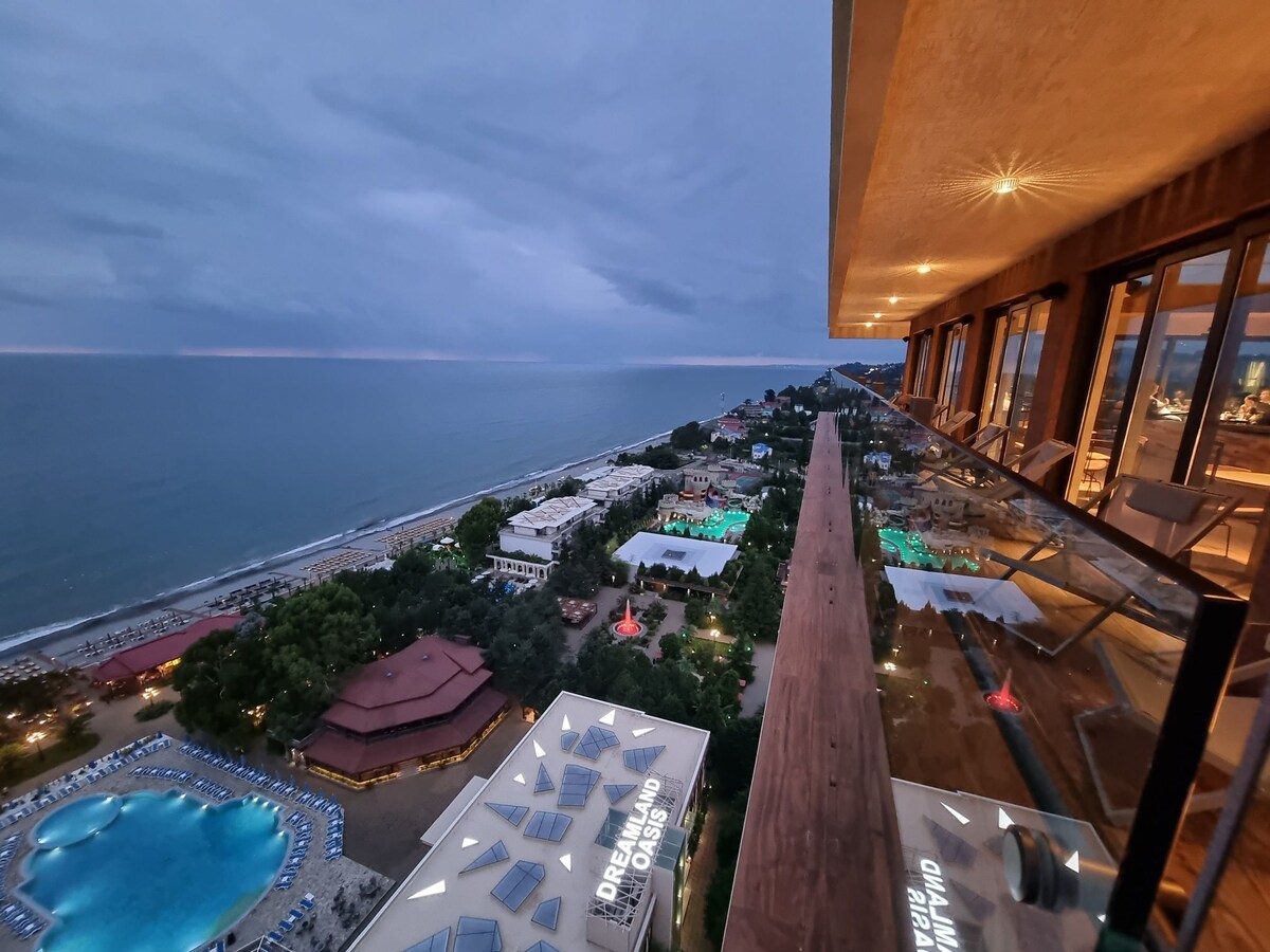 AQUI CONHEÇA A HOSPITALIDADE GEORGIANA E A ORDEM EUROPEIA Aparthotel "LUXURY DREAMLAND OASIS APARTMENTS" é um apartamento de suíte familiar, localizado no único complexo georgiano-austríaco "DREAMLAND OASIS" - o melhor hotel de praia da Geórgia. O complexo "DREAMLAND OASIS" tem tudo para lazer variado de crianças e adultos. Está localizado junto ao mar na primeira linha na sua própria área protegida de mais de 10 hectares.