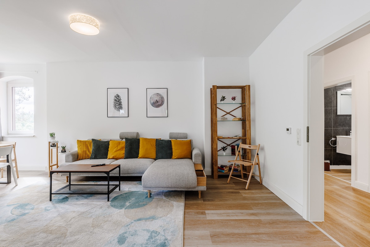 Within a 6000 sqm plot below the Veste Coburg you get a bungalow with every comfort. 3 rooms, 100 sqm, with kitchen (equipped with everything), two bathrooms, secluded terrace with large garden. Absolutely quiet and yet right in the middle of it all. 5 minutes by car and 10 minutes on foot to the center. High-quality furnishings. Floor-to-ceiling windows with a wonderful view of nature and Coburg.