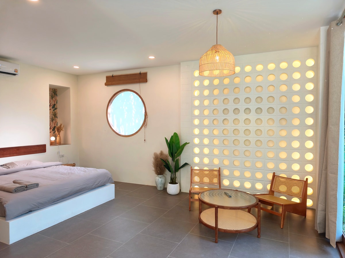 Espaçoso: Aninhada nas margens da praia de Bang Por, esta moradia de um quarto tem uma vibe artística. O espaço de estar é luminoso e arejado, com grandes janelas de madeira que se abrem, proporcionando vistas deslumbrantes para o oceano. O quarto é confortável com cama king-size e lençóis brancos. O grande terraço exterior da moradia é perfeito para aproveitar o sol e desfrutar da brisa salgada do oceano. Esta moradia à beira-mar é o destino de férias perfeito para casais. Observação: a eletricidade é pré-paga a 200 THB/ dia