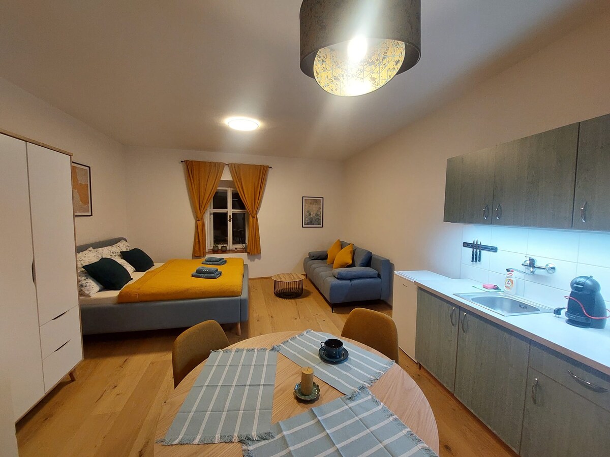 Estúdio elegante e totalmente equipado no coração de Kutná Hora.Cama de casal confortável, sofá-cama, smart TV e cozinha moderna com forno, fogão, micro-ondas e cafeteira.Casa de banho com chuveiro e máquina de lavar roupa.Espaço amplo e luminoso em uma casa tranquila com belas áreas comuns.O centro histórico, restaurantes e cafés ficam a poucos minutos a pé.Ideal para um casal ou uma viagem de negócios.É proibido fumar e realizar festas, e o respeito pela tranquilidade noturna é fundamental.