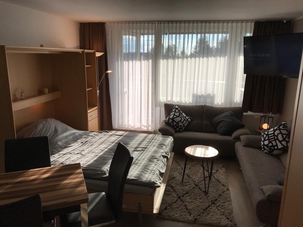 Apartamento recém-reformado, decorado e projetado com muito carinho, uma mistura de Era Espacial e minimalismo. Pôr do sol e céu de tirar o fôlego, com tempo claro, até mesmo com vista para os Alpes. O apartamento está localizado em um grande complexo de férias, que foi pioneiro em termos de arquitetura na década de 70 (a revista Bauwelt de 1973 está no apartamento). No verão, com rede e piscina ao ar livre, no inverno, com piscina coberta e saunas. Há também uma academia no prédio. Tudo incluso.