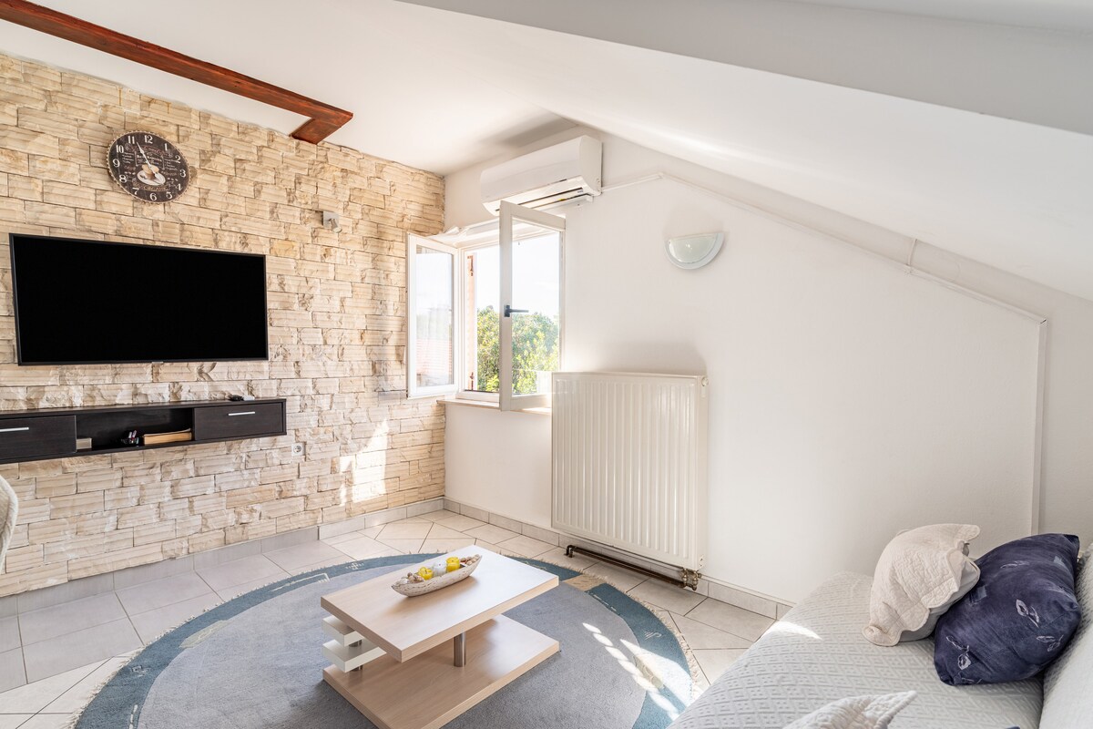 Apartamento agradável, moderno, com dois quartos, ar condicionado e varanda, a apenas 20 m da praia e a 700 m do centro da cidade. Está localizado no 2º andar de um prédio residencial em uma área muito tranquila. Rodeado por vegetação e um pátio comum. Fica a 300 m da principal estação rodoviária e do mercado, a 200 m do hospital, a 200 m dos correios e do banco, a 10 km do aeroporto de Zadar-Zemunik. O apartamento tem seu próprio estacionamento privativo gratuito ao lado do edifício.