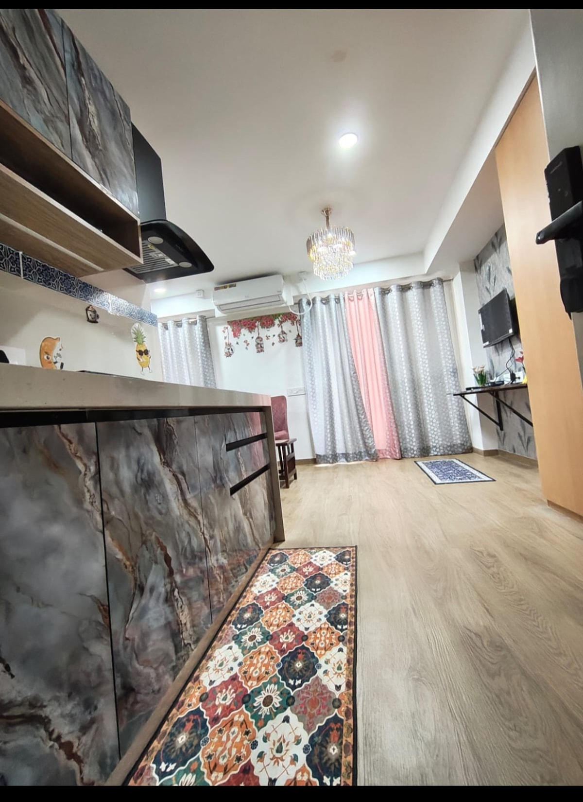 É um apartamento com vista direta para a pista/aeroporto, localizado a 600 metros a pé do aeroporto. Descubra o luxo intemporal na nossa casa de família, onde os interiores pretos ousados se encontram com detalhes dourados cintilantes. Os móveis artesanais em madeira Shisham trazem calor, riqueza, charme patrimonial, misturando-se perfeitamente com a sofisticação moderna. Assentos luxuosos, iluminação dourada e detalhes meticulosos criam um ambiente de elegância real, oferecendo aos hóspedes uma estadia inesquecível num espaço concebido para o máximo conforto e estilo.
