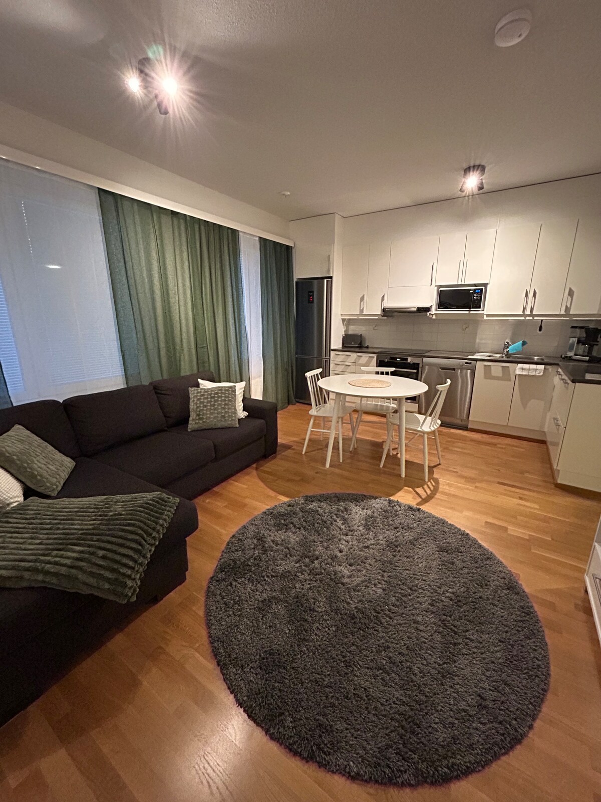 novo apartamento luminoso e moderno no último andar de uma casa no meio dos serviços da cidade. O apartamento tem sauna própria e academia na garagem da casa. Há muitas vagas de estacionamento pagas pela cidade nas proximidades. Ounasvaara 4,2 km Aeroporto 9,8 km Santa Claus Village 8,9 km Arktikum 1.6 km Centro 450m Encontre-nos no facebook e instagram @airbnb_rovaniemi_lepala