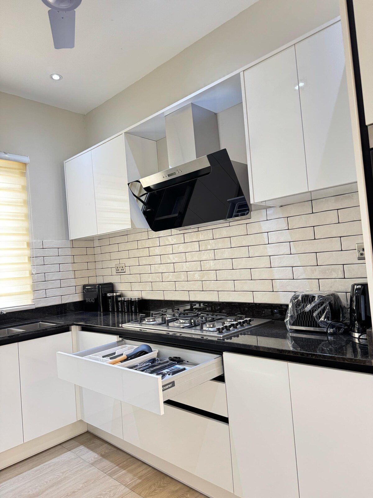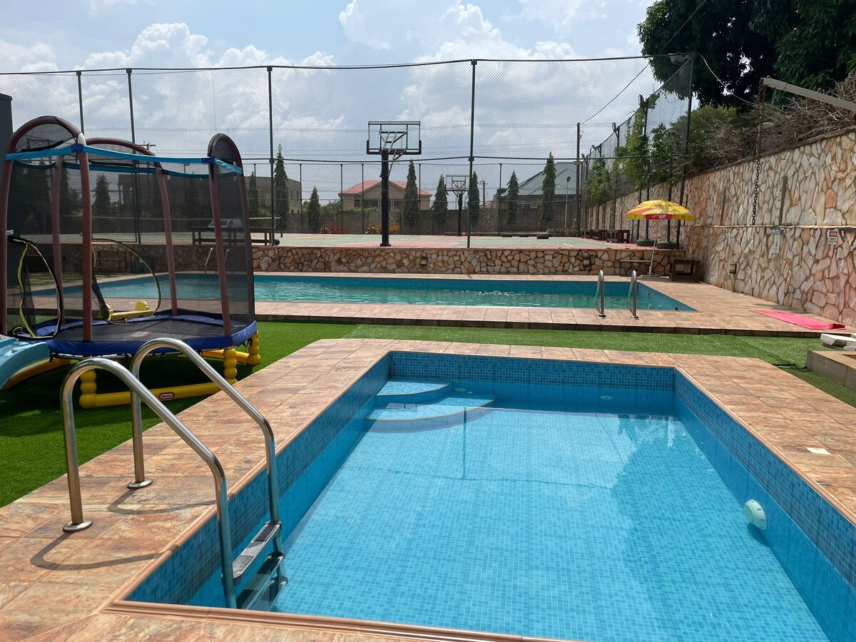 ☞ Private pool with lounge seating (3.5 ft. shallow end, 6.5 ft. deep end, 10x23 pool) 🏊 ☞ Starlink Wi-Fi (250+ Mbps) 🌐 ☞ 24/7 power (solar + backup generator) ⚡ ✭ Cozy King Size Beds (180x200 cm) 🛏️ ✭ Optional chauffeur & chef services 🚘👨🏾🍳 ✭ Daily Cleaning available 🧹 ☞ 3850 sq. ft home ☞ Smart TVs + premium Samsung 11.1.4 Surround Sound Bluetooth speakers 🎬 ☞ Parking (onsite, 4 cars) ☞ Washer + Dryer ☞ Fully equipped + stocked kitchen ☞ A/C 》25 - 30 mins to the airport
