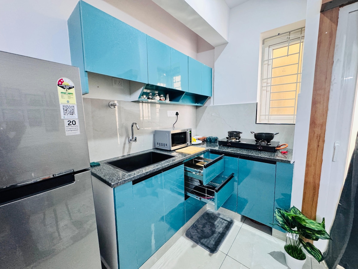 This independent contemporary living space has everything to make you feel at home - Air Conditioner, WiFi, smart tv, 2 working tabels,RO water filter, microwave, gas stove, fridge, LG washing machine,mixer & grinder, Iron box,electric kettle, Deewan, queen size bed, geyser and attached bathroom. City Pearl, Easy Bazaar and 7 Days supermarkets are within a km. Kitchen is well decked with essential utensils which may inspire you to cook delicious meals.