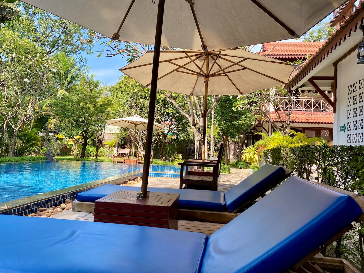 Sala House: Private Tropical Oasis Traditional Khmer Villa with Natural Pool! Location: Located behind Wat Damnak Pagoda. Walking distance to Pub Street; 20-minute TukTuk ride to Angkor Wat. To ensure a smooth arrival, we offer a 50% discount on airport pickups. Please note that airport drop-offs for your departure are available at our standard rate of $50. NOTE: Guests assume all risk for pool and stair use. By booking, you waive liability for injury or loss. The entire house is yours!