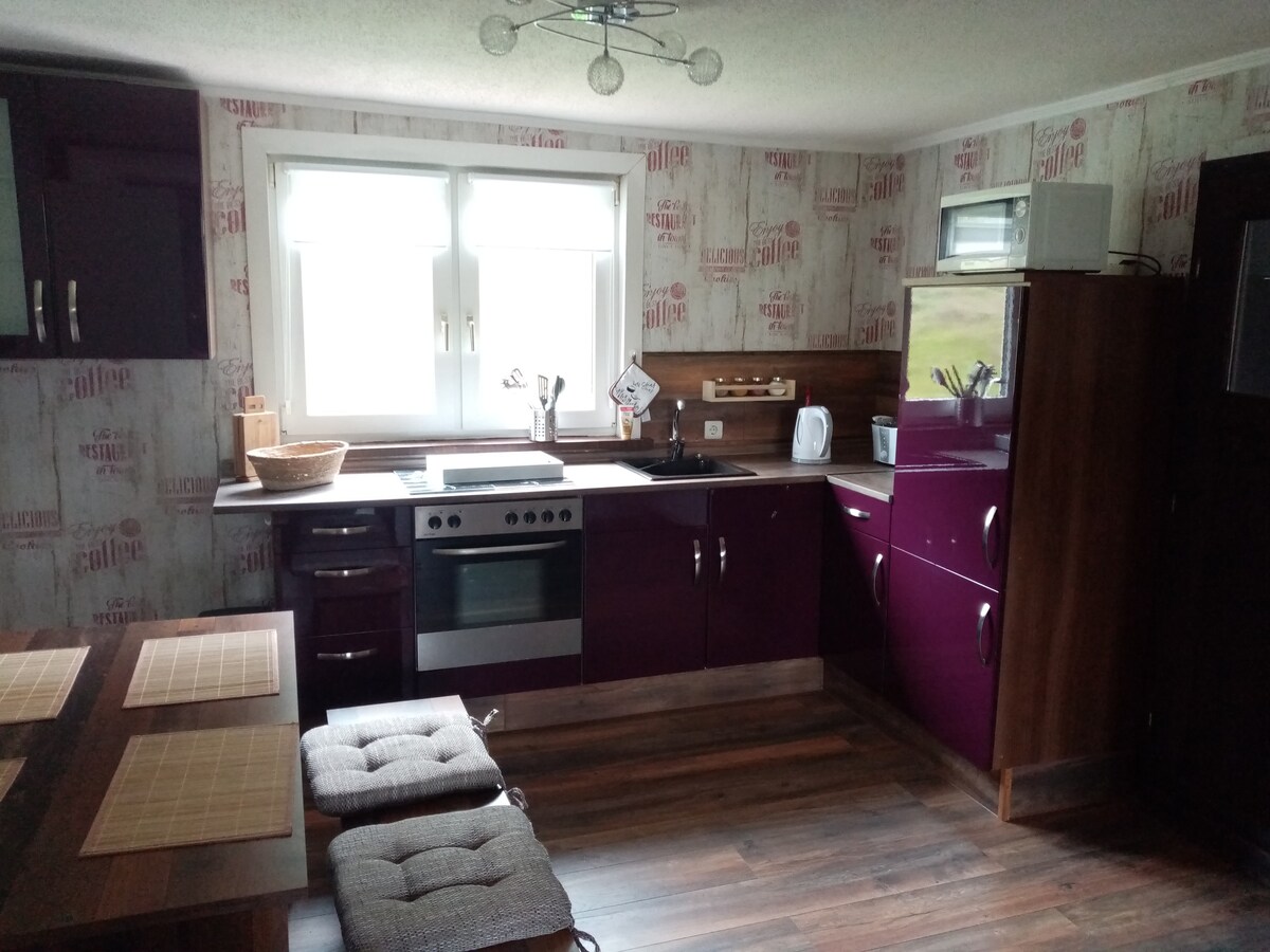 Experimente o toque mediterrâneo no meio do coração verde da Alemanha. O alojamento é caracterizado pela sua estrutura sustentável e seu ambiente único. Vigas de carvalho e tábuas de carvalho da Turíngia, gesso argiloso em cores extraordinárias, uma grande mesa de carvalho de um tronco, um sofisticado sofá para relaxar, um quarto para sonhar, um fogão italiano e uma cozinha aconchegante estão prontos para você. A proximidade imediata com a floresta que você vai adorar.