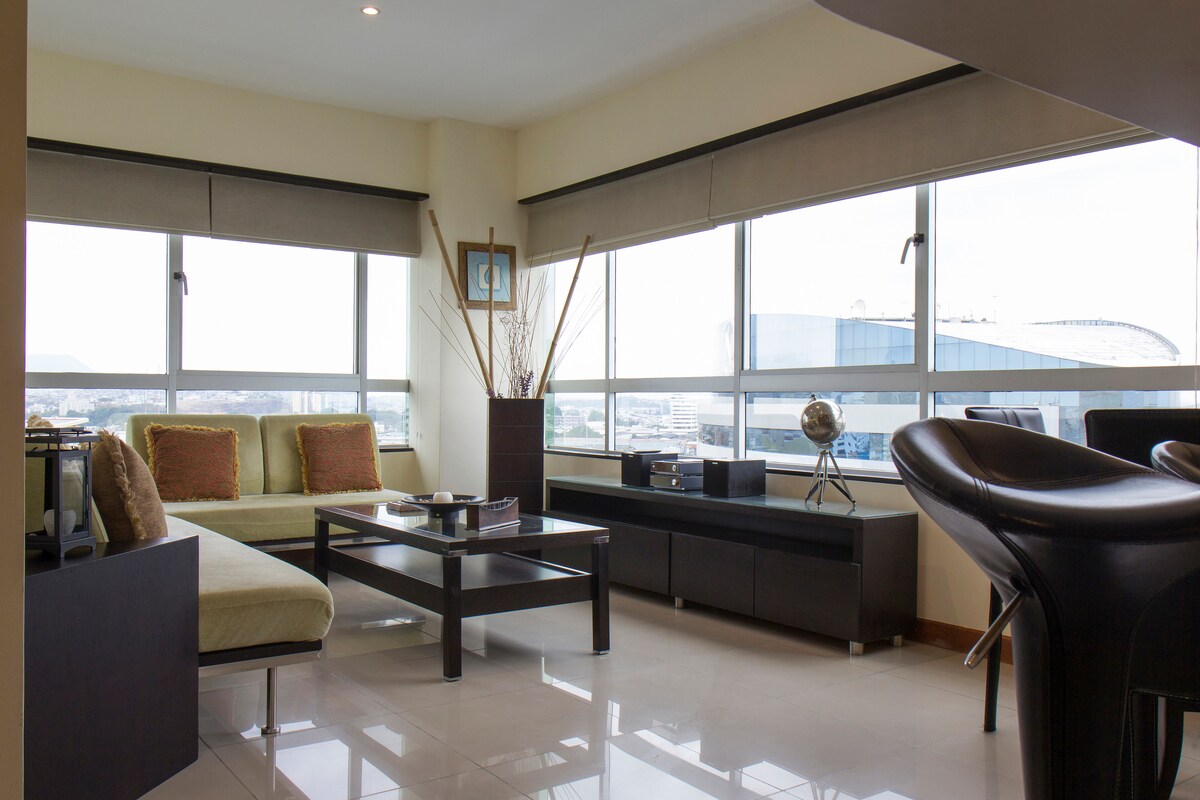 Suíte moderna, confortável e mobiliada localizada no Edifício de Luxo das Suítes da Cidade: dois elevadores, segurança 24h,acesso a diferentes áreas com cartão eletrônico, piscina interna, academia e sala de eventos. Localizados na Avenida Carrion, ao lado do Edifício, estão dois centros comerciais muito importantes C.C. City Mall e La Rotonda, e um My Commissħ a um quarteirão de distância. Também fica a 5,4 km -15 minutos do Aeroporto e 6,7 km -17 min do Terminal Terreno de Guayaquil.
