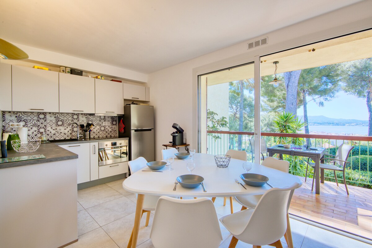 Apartamento reformado na bela e longa praia de Bergerie De frente para o mar, com os pés na água diretamente na praia, Sabine e Sébastien recebem você em seu magnífico casulo contemporâneo. Um verdadeiro refúgio para os amantes do mar, você não vai querer desviar os olhos dele e poderá desfrutar do nascer do sol sobre as Ilhas de Ouro na cama. Ambiente aconchegante e acolhedor, o apartamento e seu terraço de 27 m2 estão no final da residência para mais privacidade.