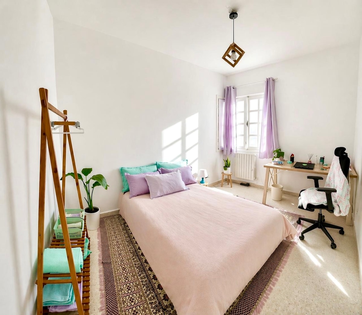 Desfrute de uma estadia confortável neste quarto espaçoso no nosso apartamento de três quartos, localizado num ambiente tranquilo. Destaque: um espaço de trabalho inspirador com uma grande secretária com detalhes coloridos. Conforto: uma cama de casal com base em madeira maciça e cortinados opacos para garantir noites tranquilas e escuras. Luminosidade e comodidades: uma janela grande proporciona muita luz natural ao longo do dia.